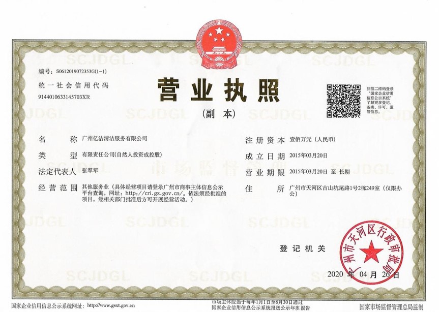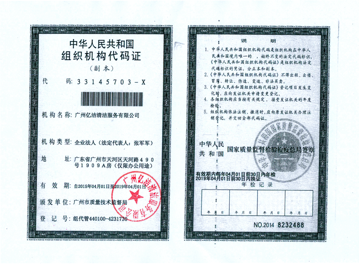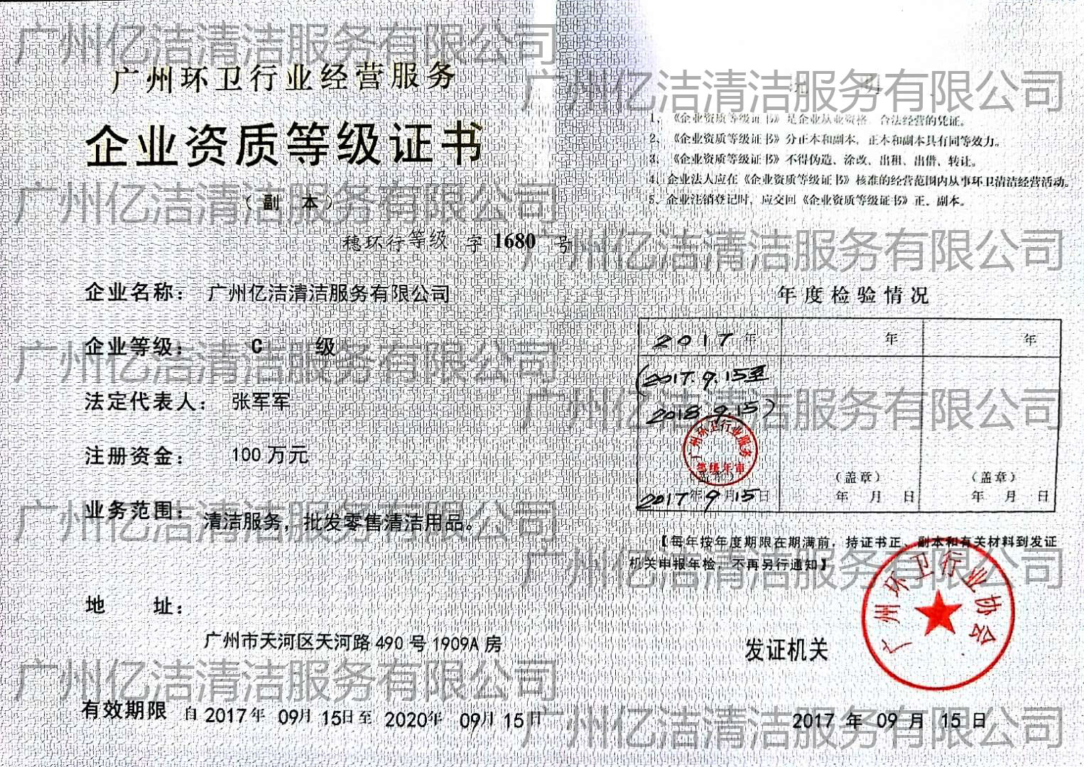 廣州億潔清潔服務有限公司是經(jīng)廣州市工商行政管理局批準成立的(注冊資本:100萬元人民幣)。具有獨立法人資質(zhì)。公司成立2015年,公司具備完善的管理體系和高素質(zhì)管理隊伍,擁有特種技術人員33名,保潔服務人員上萬名,覆蓋廣州市,能及時調(diào)配并快速投入高效運行。我們的每個員工都經(jīng)過公司的嚴格篩選,嚴格培訓,定期培訓后持證上崗以保證服務品質(zhì),保障客戶的權利,利益,形象等不受損失。 廣州億潔清潔公司是一家設備齊全,技術強大的綜合型清潔服務公司,為客戶提供完善服務尊定了堅定的基礎。 司于2010年全面推行了ISO9001質(zhì)量管理體系認證和ISO14001國際環(huán)保體系認證。先后獲得廣州高層建筑外墻清洗維修作業(yè)【安全資質(zhì)證書】、【廣州環(huán)衛(wèi)企業(yè)等級證書C級資質(zhì)】、廣州疾控中心頒發(fā)的【四害消殺服務資質(zhì)證】、【空氣治理A級資質(zhì)】、中國石材協(xié)會頒發(fā)的【石材資質(zhì)B級資質(zhì)】等。 廣州億潔清潔服務有限公司致力于打造專業(yè)、實惠、靠譜的保潔服務公司,把專業(yè)的事情交給專業(yè)的我們,您放心! 億潔清潔服務項目: 廣州保潔服務:新建樓宇、別墅、酒店、醫(yī)院、辦公樓、賓館、企事業(yè)單位廠房竣工后開荒及裝修后精細保潔.工程保潔服務。 廣州物業(yè)托管:為廣州市各大企事業(yè)單位、賓館、政府機關、小區(qū)物業(yè)、酒店及廠房提供專業(yè)化保潔、園林、設施維護等管理服務。 廣州高空作業(yè):高空玻璃幕...[詳情]